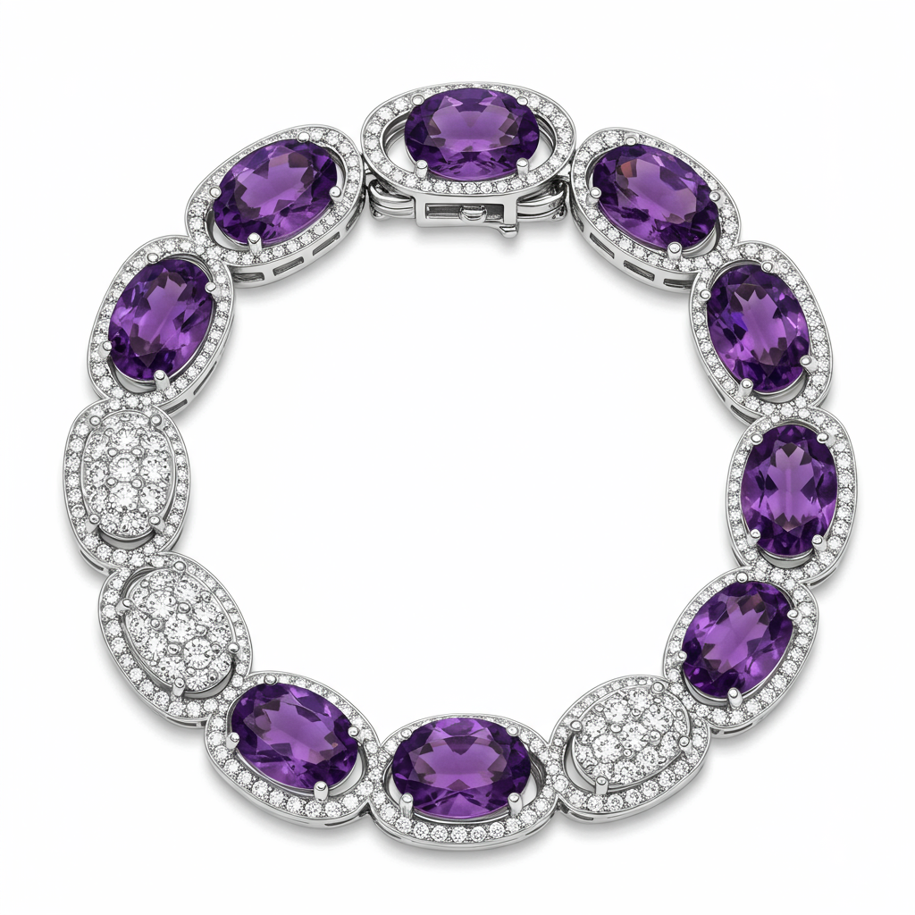 This exquisite 18KT white gold link bracelet showcases the deep, calming hues of natural amethyst. Each radiant violet gemstone is meticulously bezel-set, interspersed with delicate links encrusted with VVS diamonds for unparalleled sparkle. Designed not only for aesthetic elegance but also to evoke tranquility, this piece offers both luxurious style and a meaningful presence. It fastens securely with a hidden clasp, ensuring seamless beauty around the wrist. This bracelet is an ultimate expression of refined gemstone jewelry.