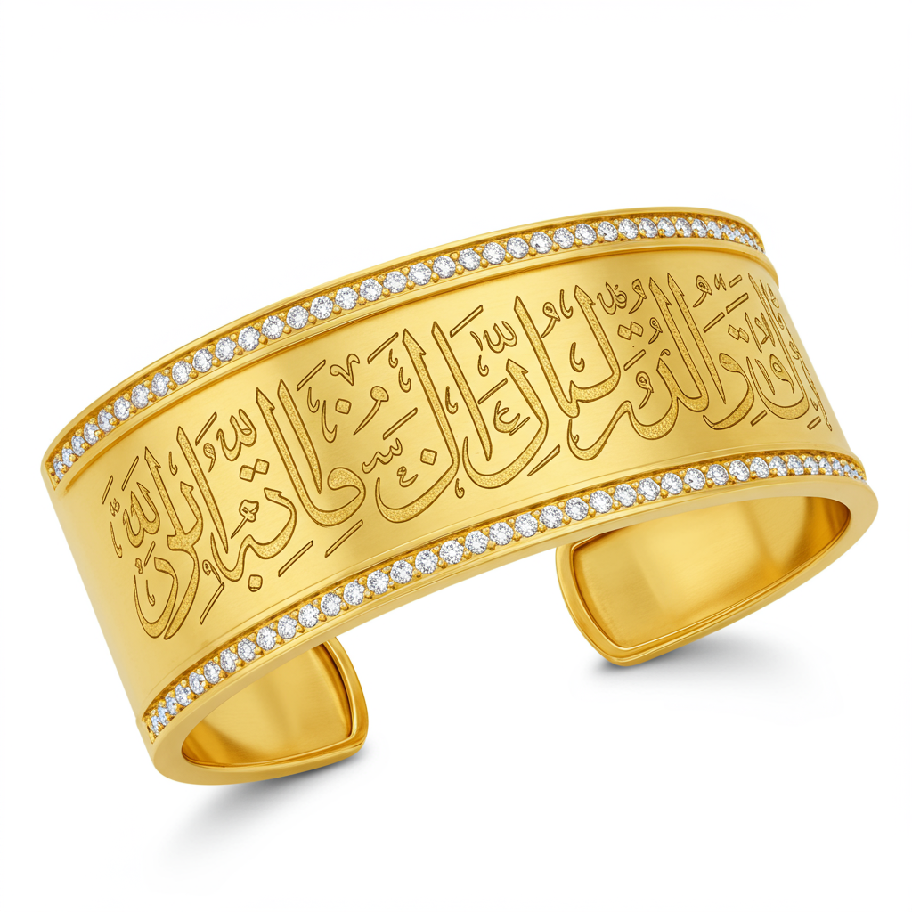 A majestic 18KT yellow gold cuff bracelet featuring the sacred Ayatul Kursi inscription meticulously engraved along its polished surface. This piece seamlessly blends deep spiritual significance with contemporary high fashion design. Accentuated by a delicate line of brilliant VVS diamonds framing the calligraphy, it offers exceptional sparkle and refinement. Wear this magnificent bracelet as a personal statement of faith and exquisite luxury, perfect for any occasion.