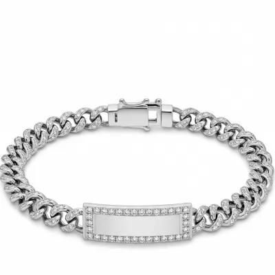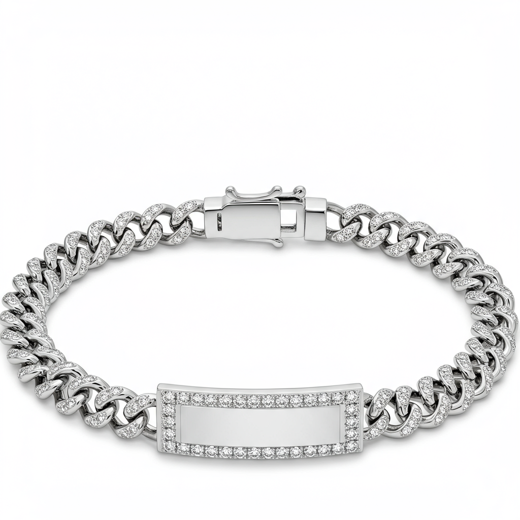 Crafted for the discerning gentleman, this custom ID bracelet represents the pinnacle of personalized luxury. The substantial curb chain links are forged in 18KT white gold, providing a masculine weight and enduring presence. Its central, customizable identification plate is masterfully set with brilliant VVS round diamonds in a tight pave. This piece serves as a powerful symbol of status, seamlessly blending high-end materials with bespoke design for an unforgettable accessory.