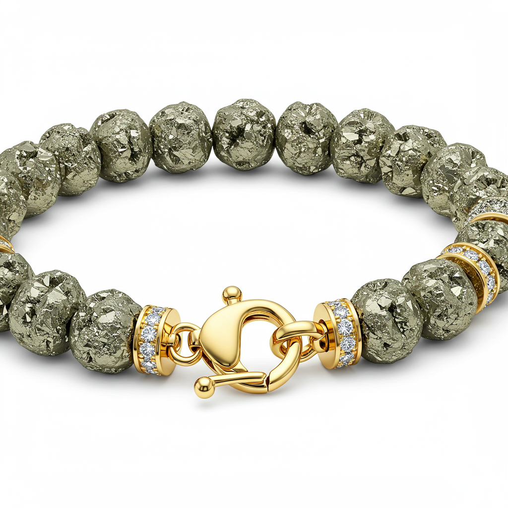 The Raw Pyrite Bracelet captures the Earth's untamed energy, featuring meticulously selected, naturally occurring pyrite nuggets that possess a dramatic, metallic luster. This striking design uses 18KT yellow gold components, ensuring durability and luxurious contrast against the dark, iridescent stone. The bracelet is finished with a secure lobster clasp subtly accented with pave-set VVS diamonds for a refined touch of brilliance. This powerful statement piece perfectly fuses contemporary organic design with high-end craftsmanship, ideal for the wearer who appreciates unique textures and grounding elements.