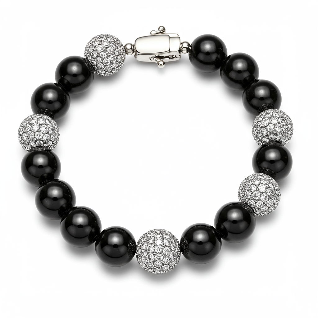 Experience grounding elegance with this distinctive Black Tourmaline Bracelet, crafted for protection and power. Polished, deep black tourmaline beads form the main body, ensuring a striking visual contrast. The bracelet is enhanced with delicate 18KT white gold spacer beads, meticulously paved with VVS quality accent diamonds. This piece seamlessly merges natural gemstone energy with high-end fine jewelry craftsmanship. It is the perfect statement accessory for daily luxury.