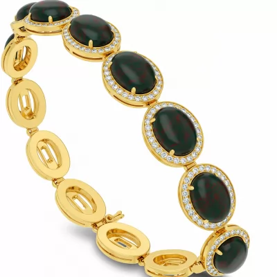 This opulent bloodstone bracelet is a testament to timeless elegance, featuring large, deep green bloodstone cabochons set within polished 18KT yellow gold links. Each link is meticulously detailed, bordered by micropavé VVS diamonds that catch the light with exceptional brilliance. The dramatic contrast between the striking matrix of the bloodstone and the fiery diamonds creates a captivating statement piece. Secured with a custom-designed hidden clasp, this heirloom-quality bracelet promises sophisticated wearability.