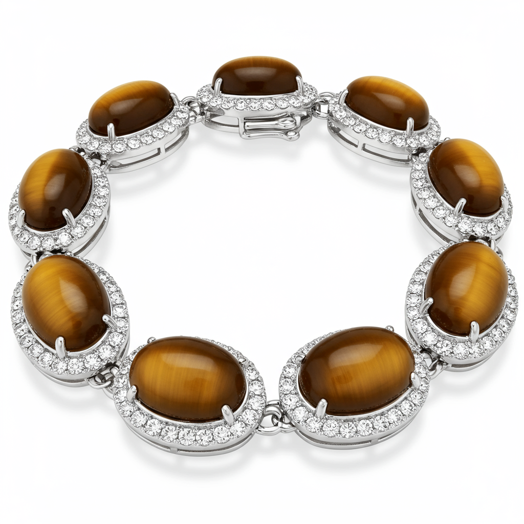 The Cat Eye Bracelet is a masterpiece of modern luxury, featuring exquisite oval cabochon cat's eye stones, known for their distinct chatoyancy, framed by brilliant diamond halos. Crafted in polished 18KT white gold, this piece offers a captivating play of light and movement on the wrist. Each natural chrysoberyl cat's eye symbolizes luck and protection. This elegant link design secures with a custom safety clasp, ensuring both comfort and sophisticated style for grand occasions.