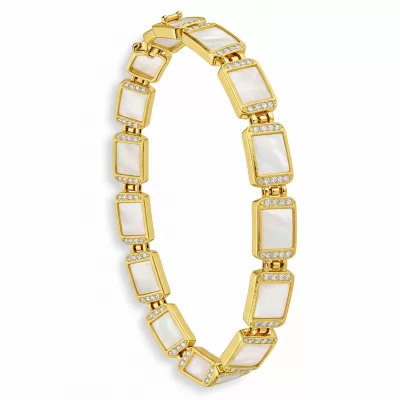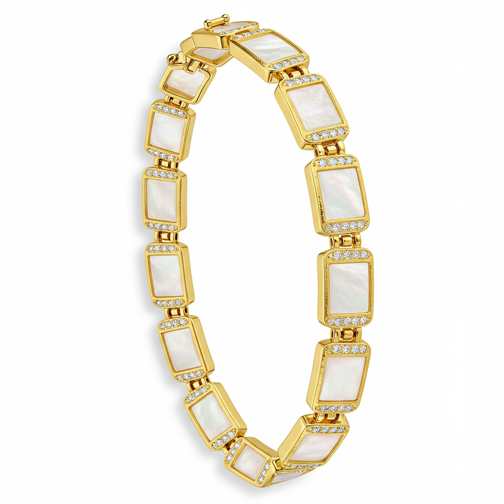 This exquisite mother of pearl bracelet captures timeless elegance with a modern twist. Featuring luminous rectangular Mother of Pearl links meticulously framed by sparkling VVS grade round diamonds. Crafted in radiant 18KT Yellow Gold, the design offers a captivating contrast between the iridescent shell and the brilliant scintillation of the diamonds. This piece fastens securely with a box clasp, ensuring both comfort and sophisticated style for any grand occasion.