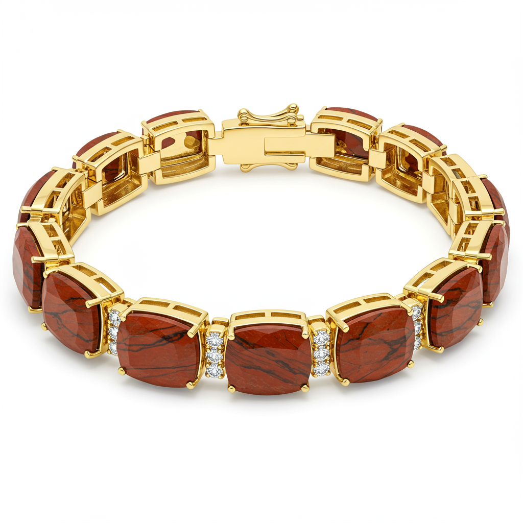 The Red Jasper Bracelet is an opulent statement piece, marrying rich earth tones with dazzling gold craftsmanship. Ten meticulously cut cushion-shaped Red Jasper stones are inlaid within articulated 18KT yellow gold links. These links are accented by micro-pave VVS diamonds, providing a subtle yet brilliant contrast to the deep, warm hues of the gemstones. This bracelet is designed for the discerning individual who seeks powerful elegance and timeless style.