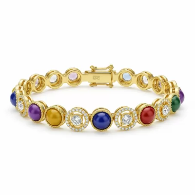 The 7 Chakra Bracelet is a magnificent manifestation of holistic luxury, meticulously crafted in radiant 18KT yellow gold. This meaningful piece showcases seven distinct, high-quality gemstones, each corresponding to an energy center to promote balance and vitality. Delicate gold spacers, accented with brilliant VVS diamonds, finish the design, ensuring a comfortable yet spiritually powerful fit for daily wear. It serves not only as a striking adornment but also as a wearable symbol of alignment and inner peace, making it a truly exceptional accessory.