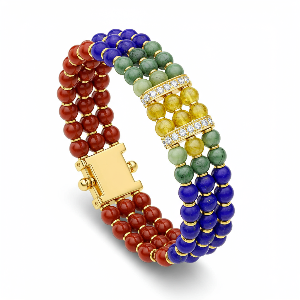 Experience alignment and holistic balance with this luxurious 7 Chakra bracelet, crafted using seven distinct, high-quality semi-precious stones. Featuring meticulously polished 6mm beads representing the body's energy centers, this piece is accented with delicate 18KT yellow gold spacers and a secure clasp. Small, brilliant VVS diamonds enhance the golden elements, adding a touch of sophisticated sparkle. This versatile piece serves as both a powerful spiritual aid and an exquisite statement of fine jewelry.