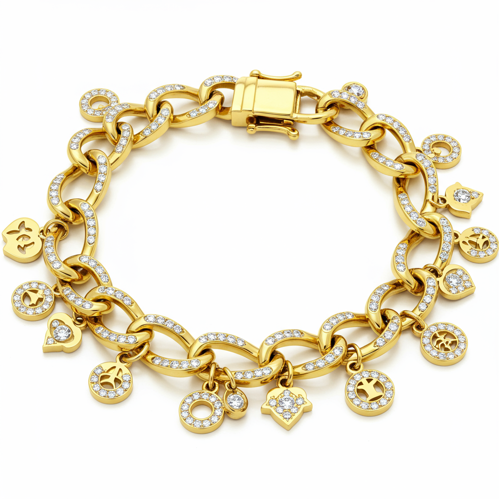 A delicate and personalized 18KT gold charm bracelet designed to celebrate youthful elegance. Featuring a robust link chain, this piece is adorned with whimsical, miniature charms meticulously pave-set with brilliant VVS diamonds. This heirloom-quality bracelet is crafted for durability and timeless charm, making it the perfect sentimental gift for a young lady. The secure, adjustable clasp ensures comfortable daily wear while maintaining a luxurious sparkle.