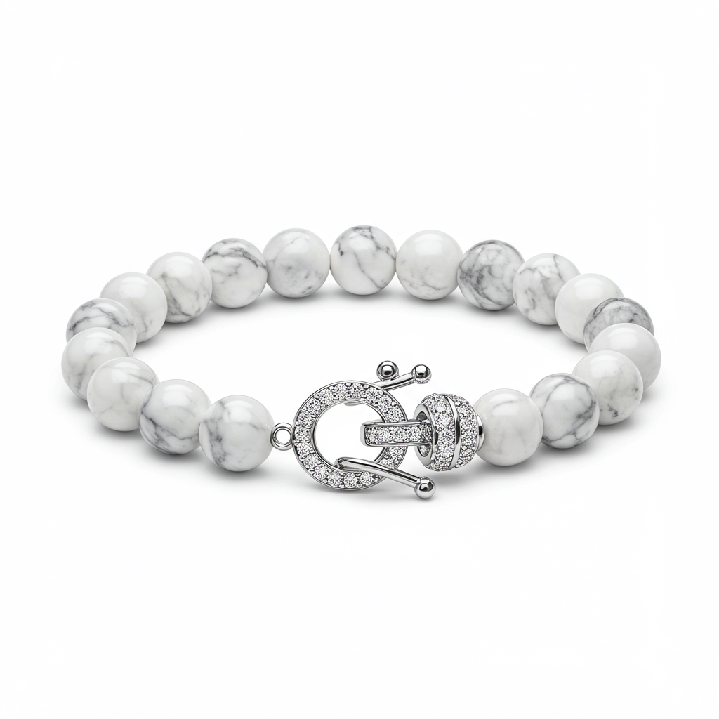 The Howlite Serenity Bracelet captures serene beauty through its smooth, polished beads, offering a calming and sophisticated accessory. This piece is meticulously hand-strung and features a substantial 18KT white gold clasp. The clasp is elegantly micro-paved with brilliant VVS diamonds, adding a flash of uncompromising luxury. Howlite's distinct marble-like finish ensures this bracelet transitions seamlessly from daywear to evening events. It is a stunning fusion of organic texture and precision-set brilliance.