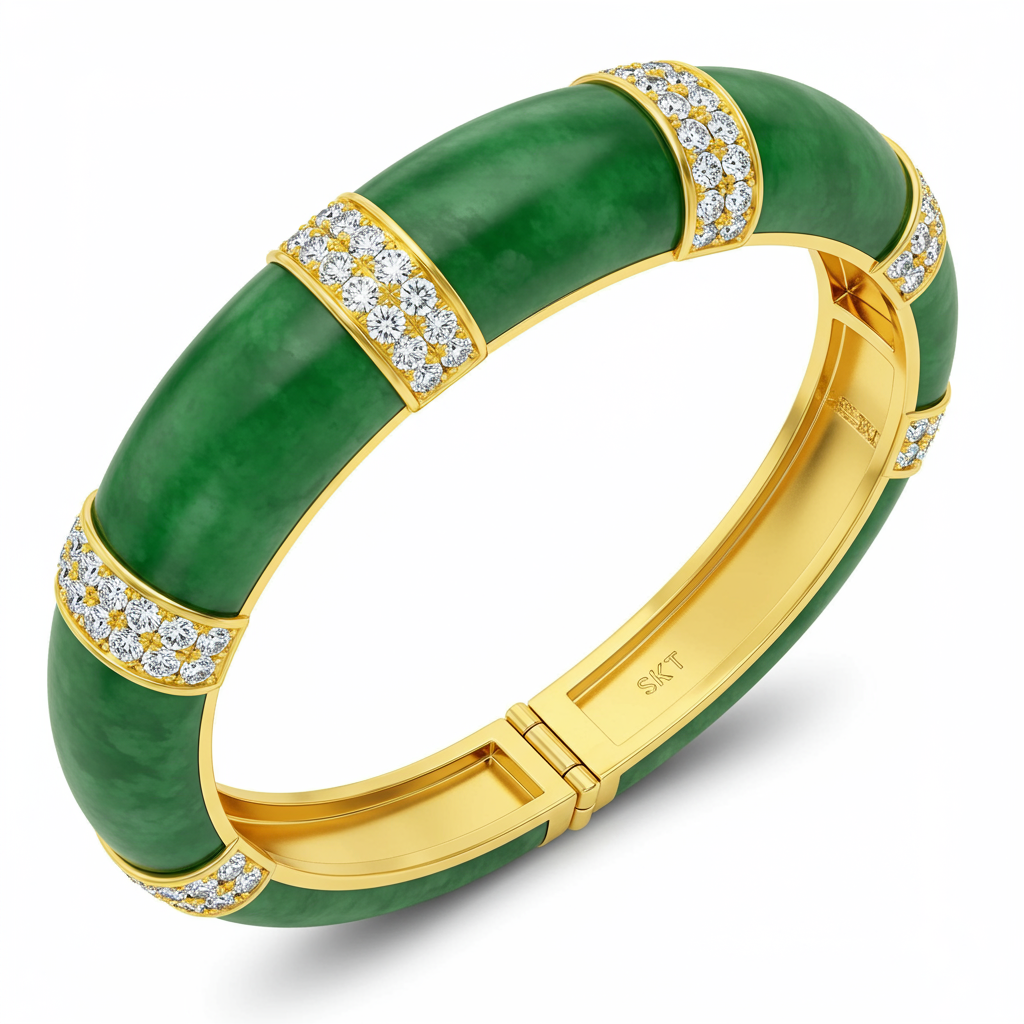 This exceptional Jade Bangle is a timeless testament to natural beauty and masterful craftsmanship. Featuring a flawless, highly polished deep-green nephrite jade component, the bracelet is elegantly capped and hinged with durable 18KT Yellow Gold ends. These gold caps are meticulously micro-paved with VVS quality round brilliant diamonds, adding a subtle yet spectacular linear sparkle. The secure hidden clasp ensures both comfort and peace of mind, positioning this piece as a stunning, generational heirloom.