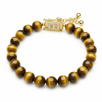 The Tiger Eye Beaded Bracelet is a magnificent piece, blending natural elegance with refined goldwork. It features highly polished, spherical Tiger Eye beads celebrated for their distinctive chatoyance and rich golden-brown hues. Secured by an 18KT yellow gold clasp adorned with micro-pave diamonds, this piece exudes luxury and protective energy. The design offers versatile wearability, functioning equally well as a statement piece or as part of a sophisticated stack.