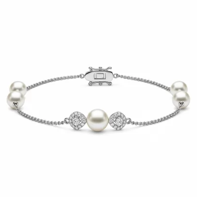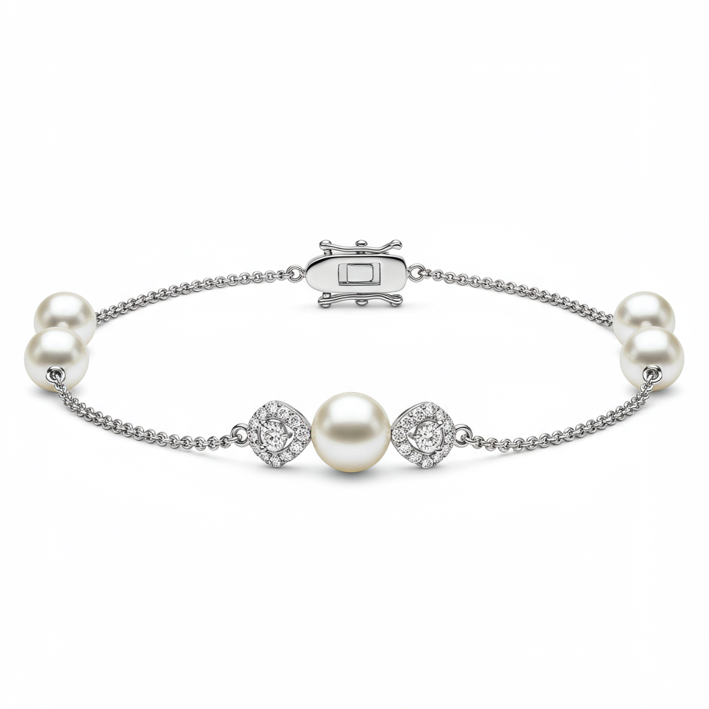 This exquisite station bracelet masterfully combines classic elegance with contemporary luxury. Seven perfectly round Akoya pearls are gracefully spaced along a delicate 18KT white gold chain, ensuring movement and comfort. Subtle accents of brilliant VVS diamonds adorn the clasp area, adding a sophisticated sparkle. This versatile piece transitions flawlessly from daily wear to formal evening events, making it an essential addition to any discerning woman's jewelry collection.