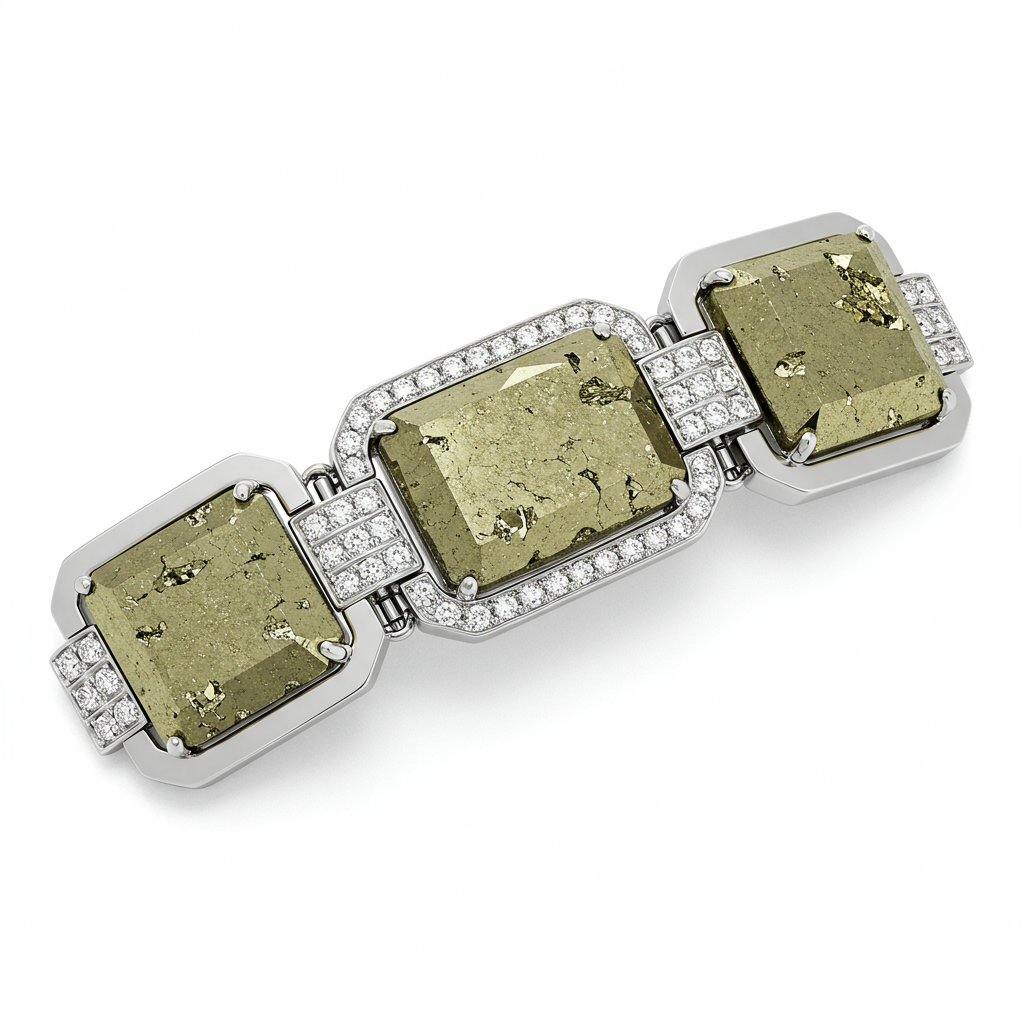 The Pyrite Stone Link Bracelet captures the powerful, metallic luster of naturally faceted pyrite, presenting a design that is both rugged and refined. Each substantial pyrite gemstone is securely bezel-set in polished 18KT white gold, creating a bold, geometric rhythm around the wrist. Complementary links are delicately paved with high-quality accent diamonds, enhancing the bracelet's overall brilliance and luxury. This striking piece serves as a remarkable statement accessory, blending raw mineral beauty with expert modern craftsmanship.