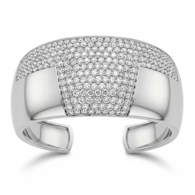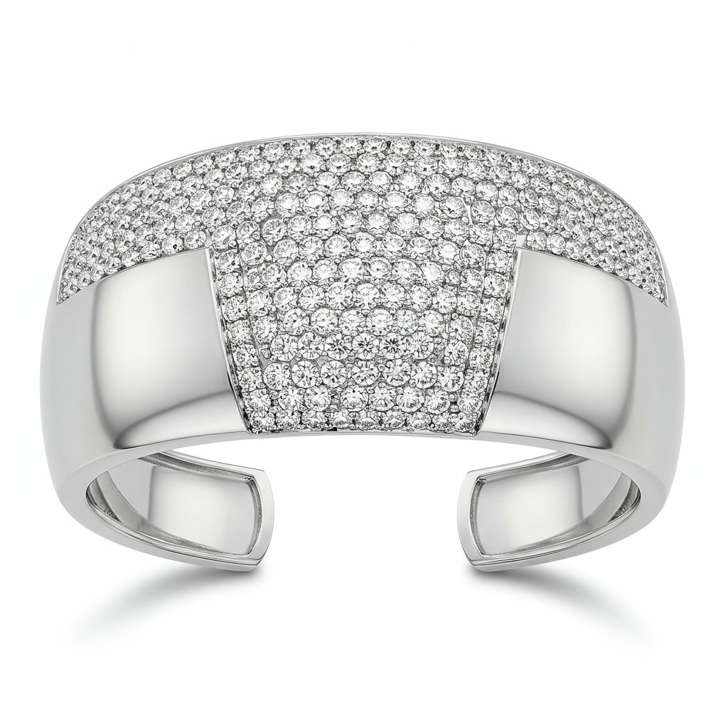 Experience the architectural brilliance of this diamond cuff bracelet, meticulously crafted in polished 18KT white gold. The bold, open structure provides a comfortable yet commanding presence on the wrist. Featuring 3.85 carats of VVS G-color round brilliant diamonds, each stone is precisely set to maximize brilliance and fire. This contemporary piece serves as the ultimate statement accessory for sophisticated evening wear and professional attire. It epitomizes modern luxury through exceptional craftsmanship and materials.