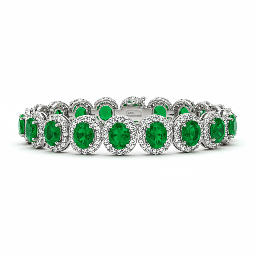 A captivating 18KT white gold link bracelet designed to showcase the vivid green of natural emeralds. Each oval emerald is perfectly complemented by a brilliant halo of VVS round diamonds, creating unparalleled sparkle. This statement piece offers remarkable elegance and sophistication, making it an ideal heirloom for special occasions. The secure clasp ensures comfort and safety while maintaining the continuous flow of the luxurious design.