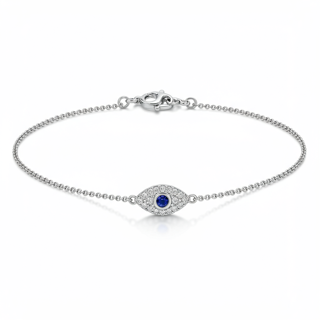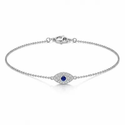 This exquisite Eye Bracelet reimagines the protective evil eye motif with modern luxury and impeccable craftsmanship. Crafted in radiant 18KT white gold, the central charm is meticulously set with brilliant VVS diamonds, creating a dazzling halo effect around a vibrant blue sapphire. The focal color stone lends depth and mystique to the design, ensuring it captivates from every angle. This delicate yet powerful piece is secured by a fine adjustable chain, offering timeless elegance for everyday wear.