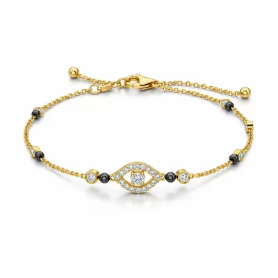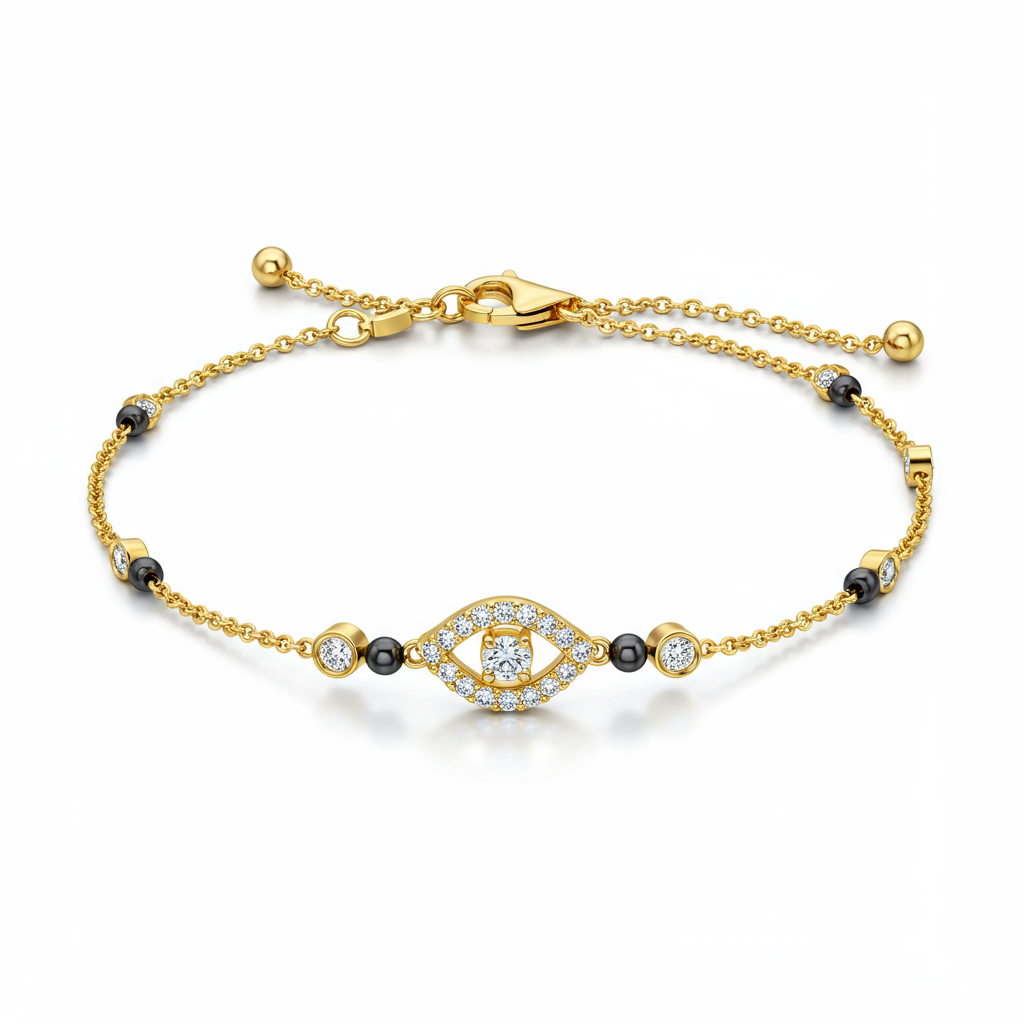 The Nazariya bracelet is a fusion of timeless tradition and contemporary elegance, designed for daily wear and protection. Crafted in luminous 18KT yellow gold, it features meticulously set VVS diamonds contrasted with classic black beads that symbolize good fortune. This adjustable piece adds a subtle, sophisticated sparkle to any wrist, ensuring comfort without compromising on high-end style. Its secure closure makes it an ideal cherished heirloom for everyday luxury.