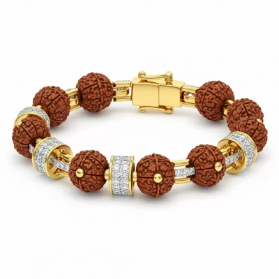 The Rudraksha Bracelet in 18KT yellow gold beautifully merges spiritual significance with contemporary design. This exquisite piece features finely sculpted gold beads interspersed with natural, polished Rudraksha elements, symbolizing protection and positive energy. Subtle VVS diamond accents are meticulously placed on the linking segments to enhance the divine glow of the bracelet. Crafted for daily wear, this piece offers a unique blend of traditional belief and high jewelry elegance, making it a powerful personal talisman that exudes luxury.