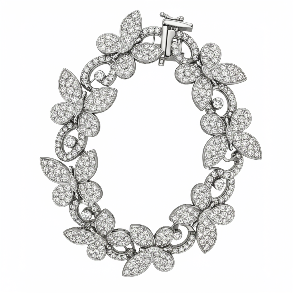 This exquisite butterfly bracelet captures the ephemeral beauty of nature, meticulously crafted in 18KT white gold. The design features symmetrical, detailed butterfly motifs, each wing fully paved with brilliant VVS round diamonds. The articulated links ensure a comfortable and fluid drape on the wrist, making it suitable for effortless daily wear or sophisticated evening events. This piece serves as a timeless emblem of transformation and feminine elegance.