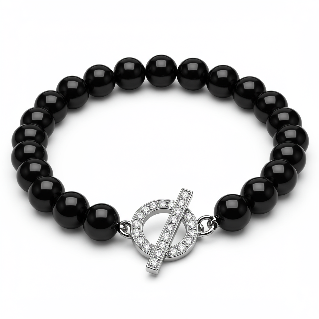 The definitive men's stone bracelet merges masculine design with high-end luxury materials. Featuring perfectly polished 8mm Black Onyx beads, this piece grounds any ensemble with an air of sophisticated strength. The secure toggle clasp is crafted from solid 18KT white gold and intricately micro-paved with brilliant round diamonds. This bracelet is an essential statement piece, balancing rugged texture with refined sparkle, perfect for the modern gentleman.