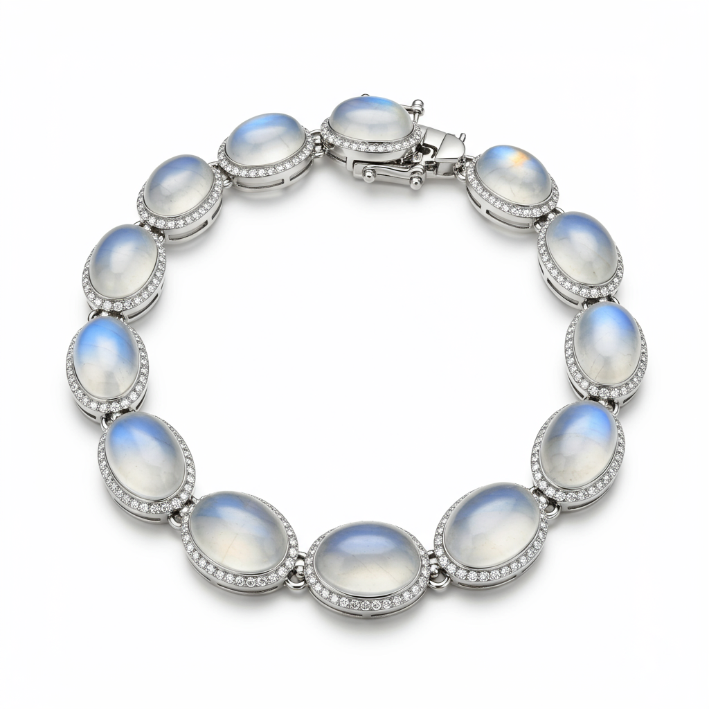The Moonstone Link Bracelet captures the ethereal glow of moonlight, crafted meticulously in 18KT white gold. It features twelve substantial cabochon-cut moonstones, each radiating a distinct schiller effect. These celestial gems are intricately framed by micro-pave set VVS diamonds, adding brilliant contrast and sophisticated sparkle. This elegant piece is secured with an invisible clasp, offering a seamless stream of light and luxury. It is the perfect statement accessory for grand occasions or refined daily wear.
