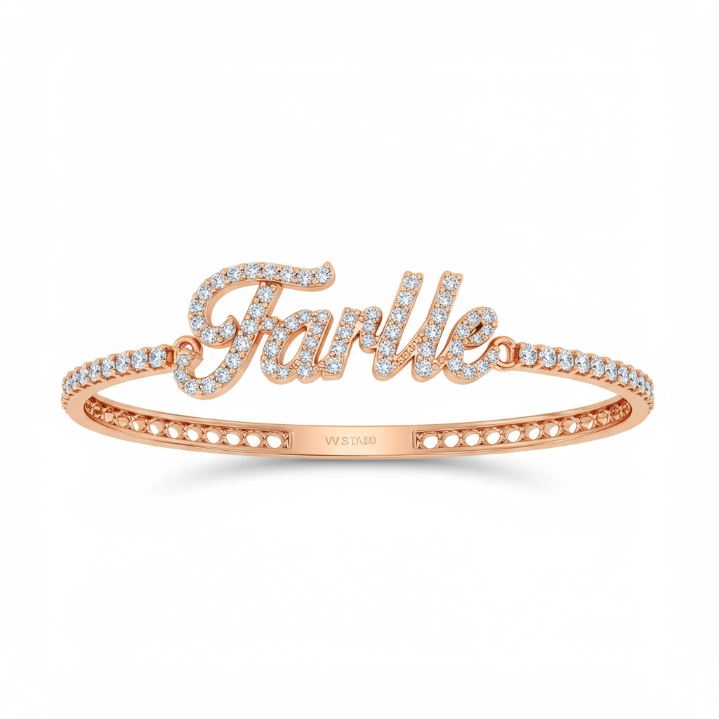 The Personalized Name Bracelet is a timeless piece designed for intimate self-expression. Crafted in luminous 18KT gold, the delicate script typography is meticulously set with brilliant VVS diamonds, creating a radiant sparkle. This bespoke piece transitions seamlessly from day wear to evening glamour, making it the perfect signature accessory. A graceful reminder of identity or a cherished loved one, it offers elegance and meaningful personalization in equal measure.