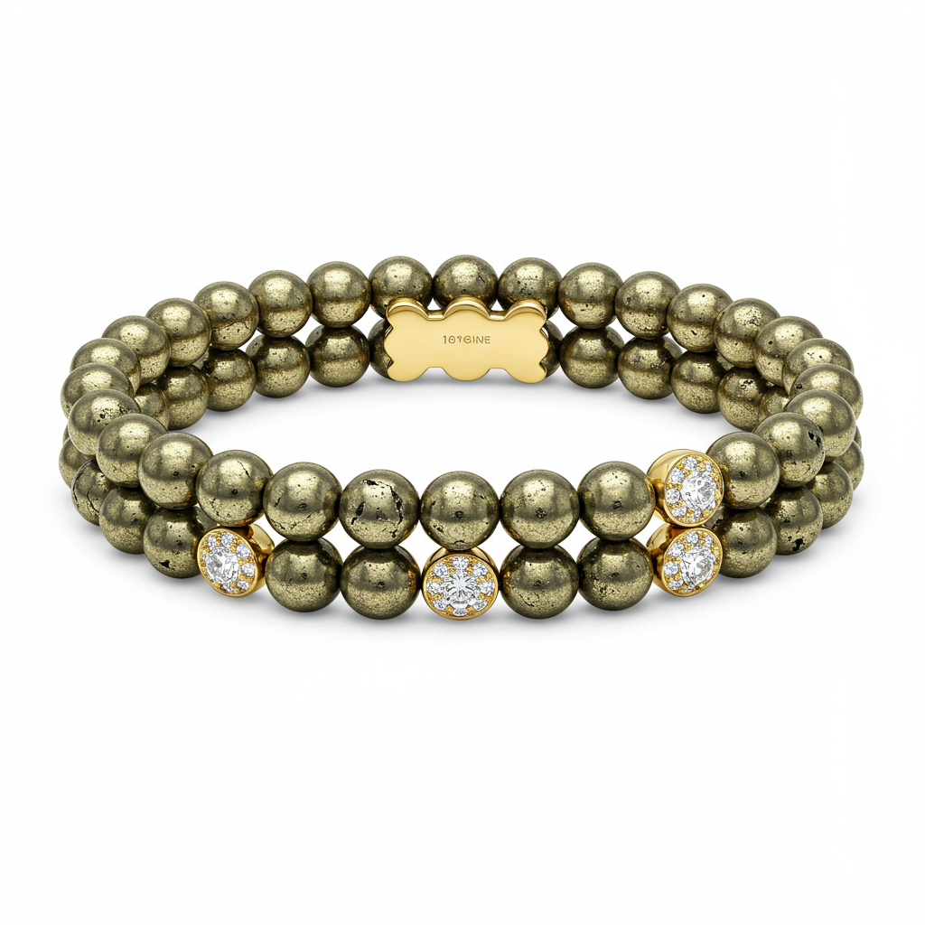 The Pyrite Lux Bracelet marries the raw, compelling beauty of natural pyrite spheres with refined 18KT yellow gold detailing. Each pyrite bead, known for its brilliant, metallic luster, is meticulously separated by pave-set diamond rondelles. This stretch-style bracelet offers exceptional comfort while delivering sophisticated brilliance and undeniable texture. It serves as a striking statement piece, symbolizing wealth and protection for the wearer.