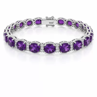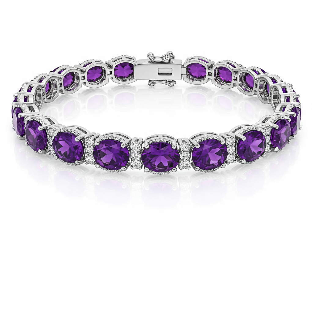 This exquisite Amethyst Bracelet embodies royal sophistication and timeless elegance. Featuring a continuous line of vibrant, saturated oval-cut amethysts, each stone is perfectly calibrated for maximum brilliance. The 18KT white gold setting provides a cool contrast, subtly accented by high-quality pave diamonds set in the intricate connecting links. This piece serves as a luxurious statement, ideal for formal occasions or as a cherished heirloom.