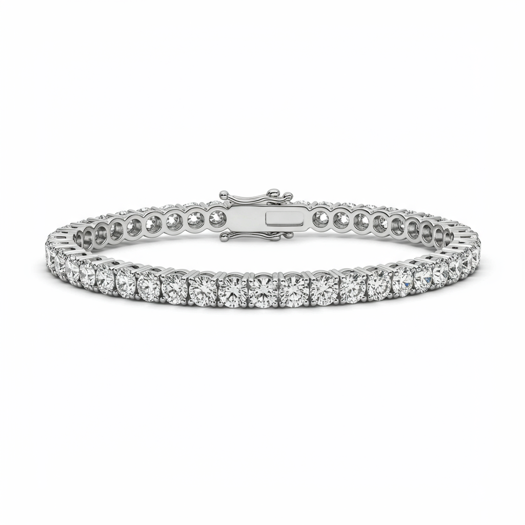 The Chandi Ka Bracelet captures timeless sophistication through its elegant, flexible design. Crafted meticulously in 18KT white gold, this bracelet features a continuous line of brilliant-cut diamonds, showcasing exceptional fire and sparkle. Each high-clarity VVS diamond is secured in a streamlined four-prong setting, ensuring maximum light exposure. This piece transitions effortlessly from daytime elegance to evening glamour, making it a foundation piece for any luxury jewelry collection.