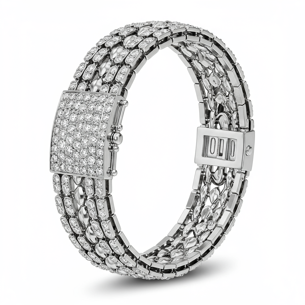 The Chandi Ka Bracelet redefines masculine luxury through exceptional craftsmanship and brilliant diamond detailing. Forged in robust 18KT white gold, this substantial cuff features a bold, articulated link structure designed for enduring comfort and commanding presence. A central channel of meticulously micro-pave set VVS diamonds provides a subtle yet powerful flash of brilliance. This piece serves as the definitive statement accessory for the modern, discerning gentleman who values quality and design.