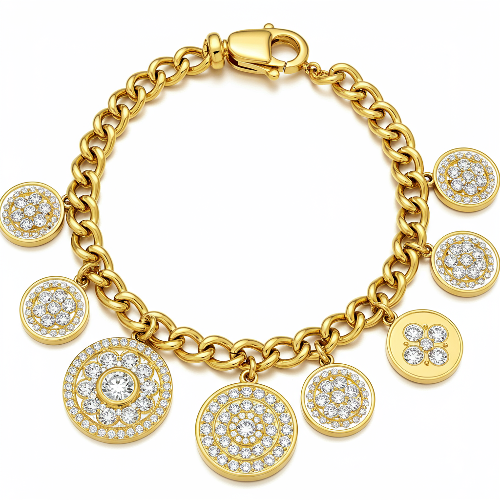 Celebrate milestones with this exquisite diamond charm bracelet, meticulously crafted in radiant 18KT Yellow Gold. The delicate link chain is designed for comfortable daily wear and secure closure. Each station charm is adorned with brilliant-cut VVS diamonds, catching the light with every movement. This elegant piece serves as a timeless canvas, perfect for adding personalized keepsakes and marking life's most precious memories.
