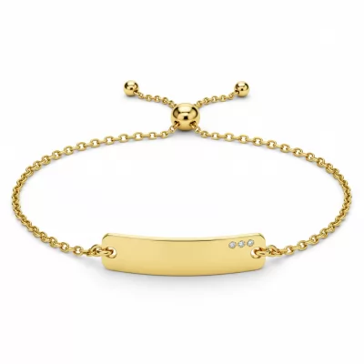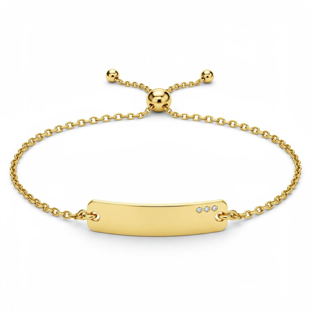 This delightful 18KT yellow gold bracelet is designed specifically for treasured little ones, offering elegance and playful charm. The adjustable link chain ensures a perfect fit, while the central polished plaque provides an ideal surface for personalization or engraving. Ten sparkling VVS round diamonds are meticulously set, adding a subtle touch of brilliance suitable for daily wear. This keepsake piece is crafted with superior craftsmanship, ensuring durability and timeless appeal for years to come.