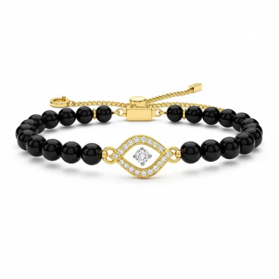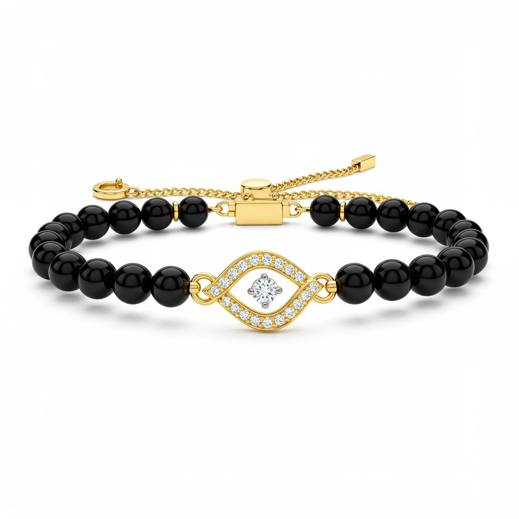 The Mangalsutra Diamond Bracelet reimagines traditional Indian commitment symbolism with exceptional modern elegance. Crafted in radiant 18KT yellow gold, this delicate piece features the iconic black beads interspersed with brilliant pavé-set VVS round diamonds. It offers a sophisticated, highly wearable commitment piece perfect for daily luxury wear. This unique bracelet is a beautiful fusion of cultural heritage and contemporary design, promising timeless allure and exceptional sparkle.