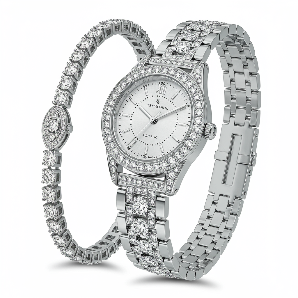 This exquisite set features a precision timepiece and a matching diamond bracelet, symbolizing timeless elegance and sophistication. Crafted in polished 18KT white gold, the watch case is subtly accented with pave-set diamonds surrounding the refined mother-of-pearl dial. The companion bracelet showcases a brilliant row of high-clarity diamonds, perfectly complementing the watch's luxurious aesthetic. This ensemble is designed for the woman who appreciates detailed craftsmanship and understated glamour.