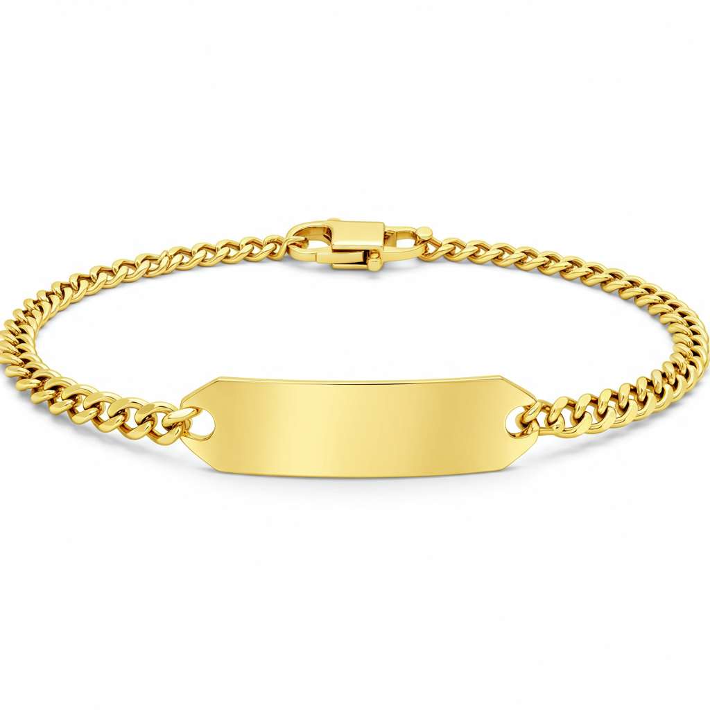Celebrate a new arrival with this charming 18KT Yellow Gold bracelet, designed specifically for baby boys. Weighing approximately 2 grams, this piece features a gentle curb chain and a small, engravable plate, perfect for personalization. The minimalist design ensures maximum comfort and safety for sensitive skin. This bracelet serves as a timeless keepsake, marking a precious milestone with the enduring warmth of high-karat gold.