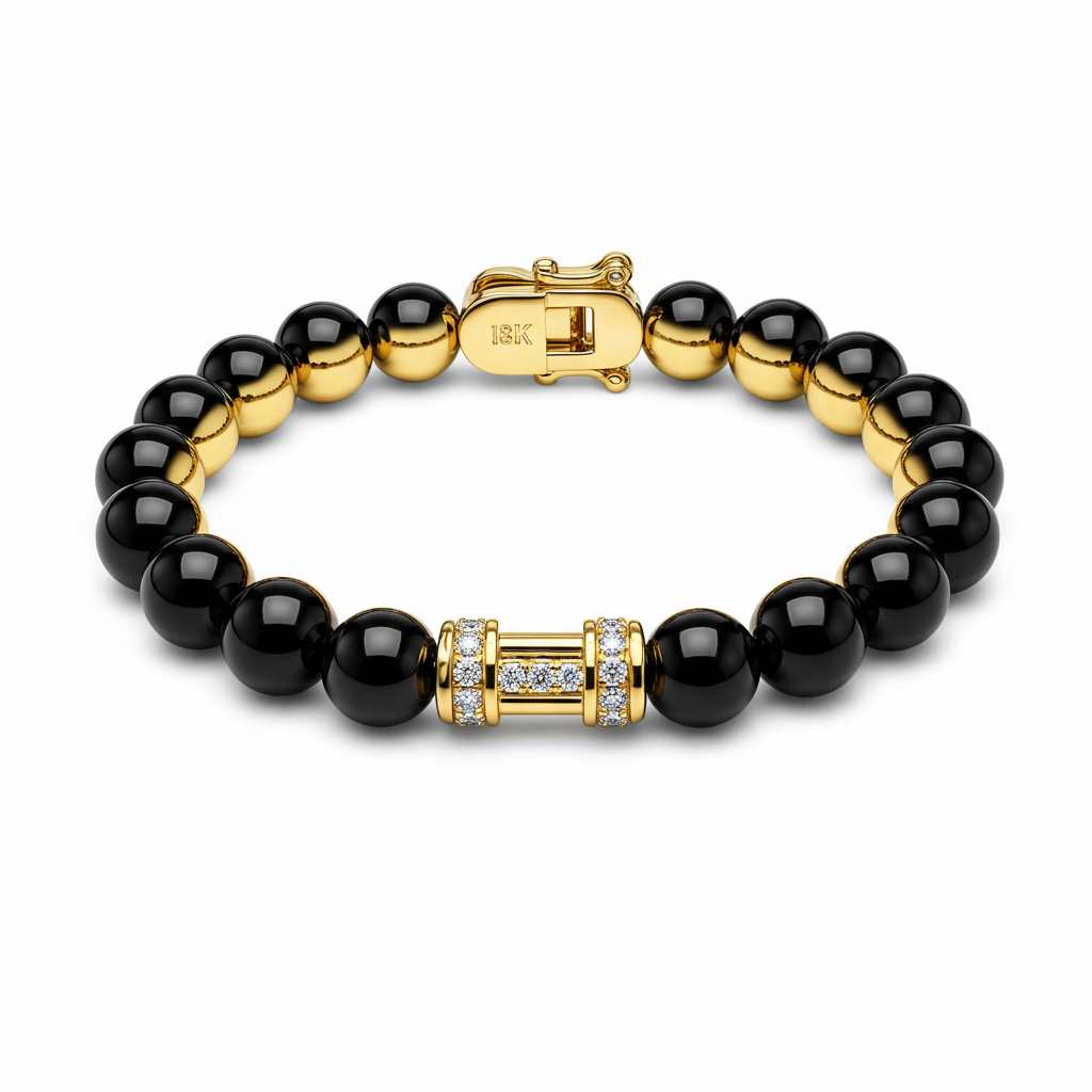 The Black Beads Bracelet Gold is a sophisticated fusion of traditional materials and modern design aesthetics. This striking piece features highly polished black onyx beads strung elegantly alongside an 18KT yellow gold centerpiece. The central element is delicately paved with high-quality brilliant-cut diamonds, adding a subtle yet powerful sparkle. Designed for versatility, this bracelet transitions flawlessly from daily wear to exclusive evening events, making it an essential luxury accessory. It offers a bold, contemporary look while maintaining timeless elegance.