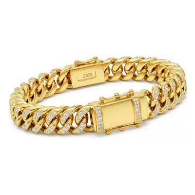 This commanding men's bracelet is crafted from 22 karat high-purity yellow gold, featuring robust, interlocking solid links that signify strength and enduring luxury. The substantial weight provides a premium feel, making it an essential statement piece for the discerning gentleman. A secure box clasp, accented with subtle high-quality diamonds, ensures both reliability and a touch of sophisticated brilliance. This timeless accessory is designed for daily wear, blending traditional craftsmanship with contemporary masculine style.