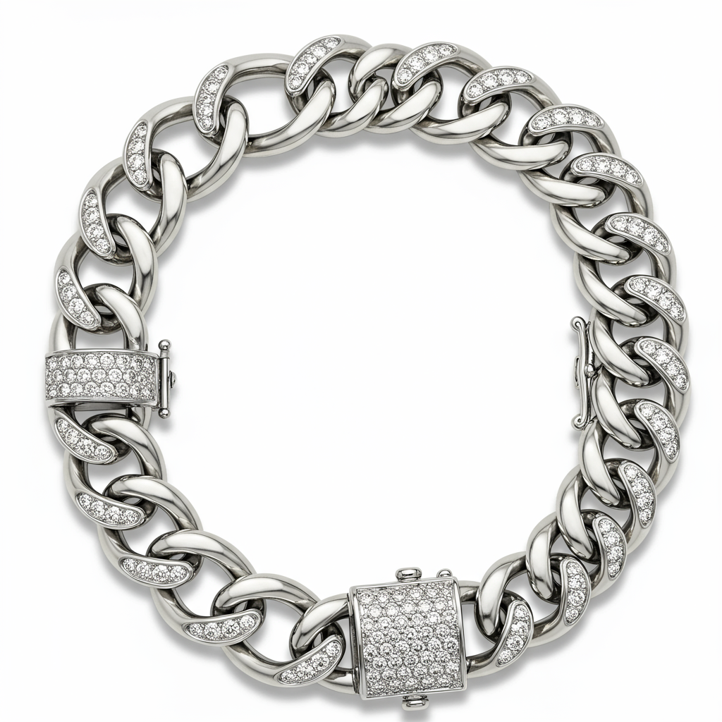 This robust bracelet redefines contemporary masculinity through a timeless link design and exceptional craftsmanship. Forged in solid 18KT white gold, the sophisticated construction offers substantial weight and fluid movement on the wrist. Subtle diamond accents, featuring VVS clarity stones, are meticulously set into the security clasp, ensuring a flash of brilliance without compromising the piece's commanding presence. This bracelet serves as a definitive statement of refined strength and luxury, perfect for the modern gentleman.