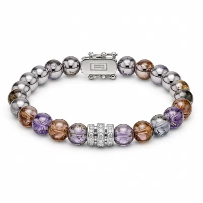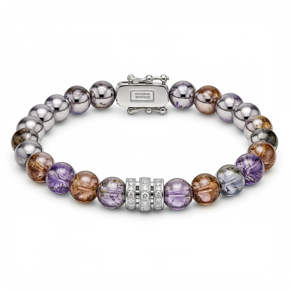 This exquisite beaded bracelet embodies modern luxury, featuring hand-polished, perfectly spherical gemstones interspersed with 18KT white gold elements. Each metal spacer is subtly accented with micro-pave VVS diamonds, adding a breathtaking sparkle that catches the light beautifully. Designed for effortless elegance, this piece offers a refined texture and sophistication suitable for both daily wear and glamorous evening events. It is secured by a finely crafted clasp ensuring comfortable and secure wear. This bracelet is a timeless addition to any distinguished collection.