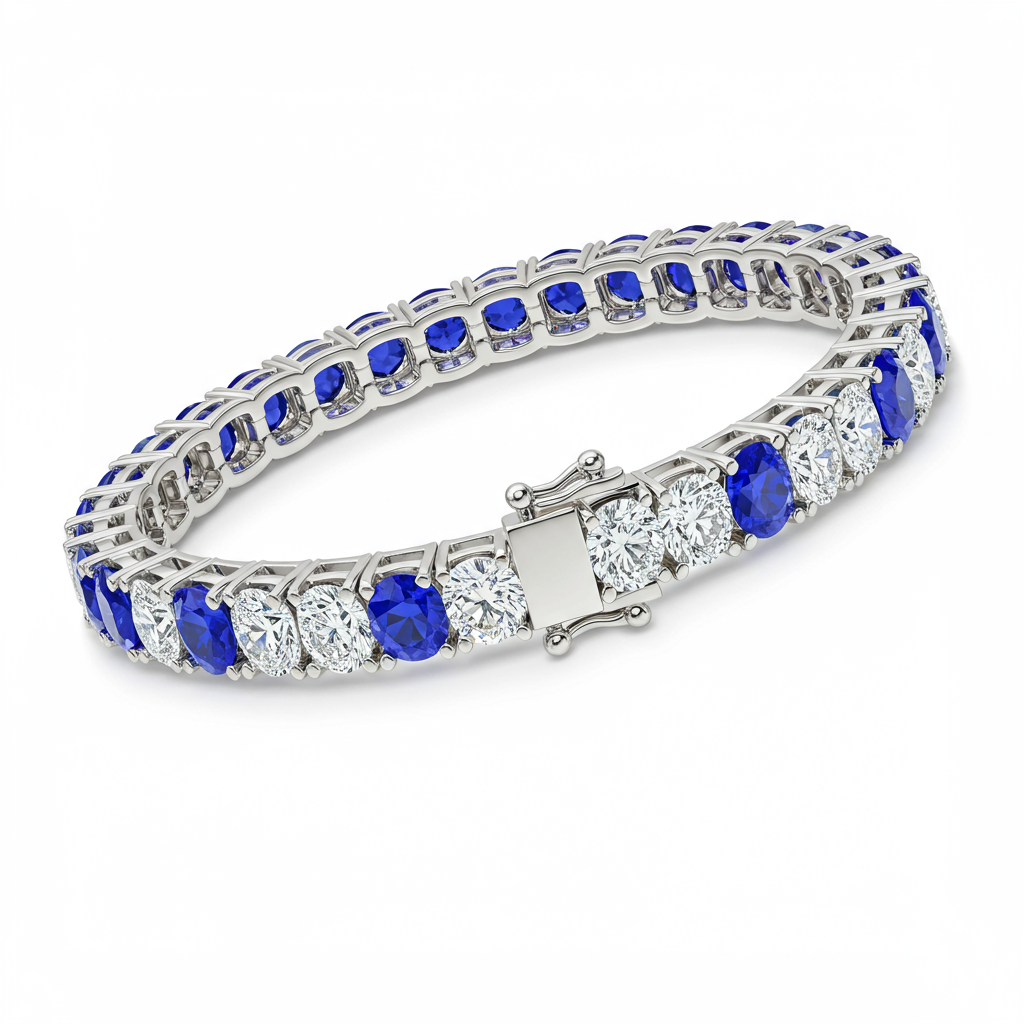 This opulent 18KT white gold bracelet showcases an alternating pattern of vibrant natural gemstones and brilliant VVS diamonds, creating a striking contrast. Each stone is meticulously secured in a four-prong basket setting, ensuring maximum light exposure and exceptional sparkle. Designed for enduring elegance, this piece offers a refined splash of color perfect for gala events or sophisticated daily wear. Its secure box clasp provides both safety and a seamless finish, making it a timeless addition to any fine jewelry collection.