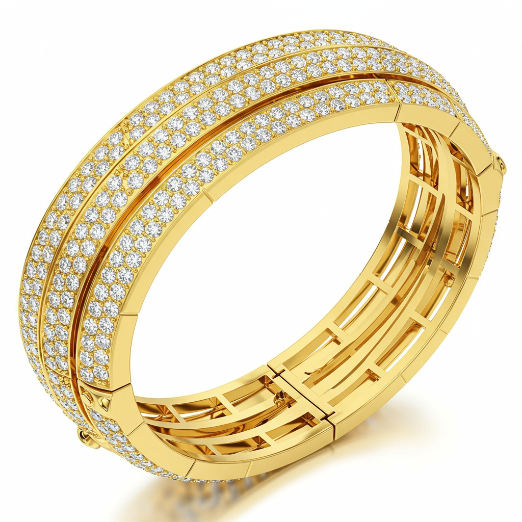 The Guruji Bracelet is a masterpiece of spiritual elegance and modern craftsmanship. It features a robust, highly polished 18KT yellow gold framework designed as a sleek, open cuff. This substantial design is meticulously embellished with perfectly calibrated pavé-set diamonds, radiating subtle brilliance with every movement. A true symbol of strength and enlightened luxury, this bracelet is crafted for the discerning individual who appreciates both tradition and contemporary high jewelry design.