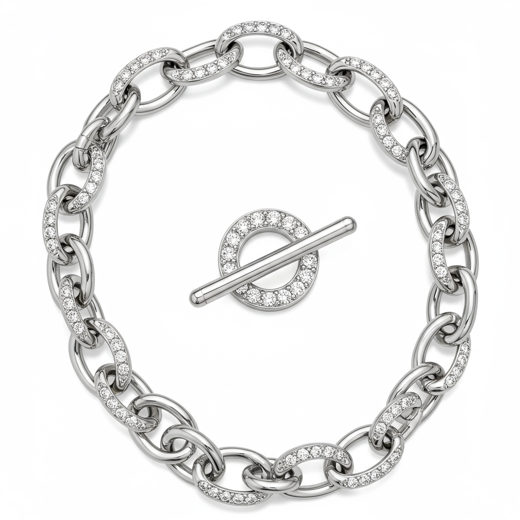 The iconic Link Bracelet embodies timeless sophistication and refined luxury, drawing inspiration from classic designer aesthetics. Crafted in highly polished 18KT white gold, this piece features a substantial yet elegant chain design that culminates in a distinctive toggle clasp closure. A signature accent link is intricately paved with high-clarity diamonds, adding a subtle, brilliant sparkle. Its robust construction and mirror finish ensure it functions as a perfect signature accessory, designed for enduring style and daily wear.