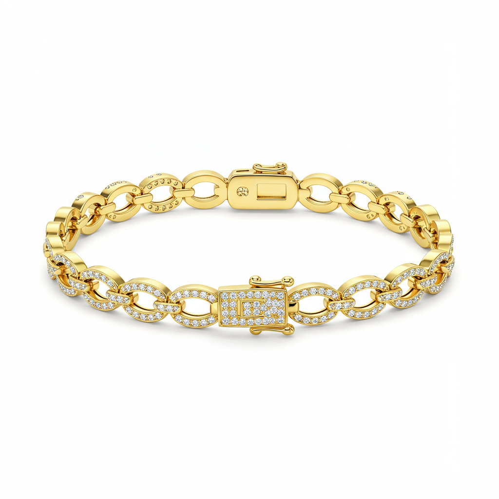 This exquisite women's chain bracelet is crafted in luxurious 18KT yellow gold, presenting a timeless design suitable for daily wear or layering. The delicate yet durable oval links are meticulously polished to achieve a mirror-like shine. A secure box clasp, discreetly set with micro-pave VVS diamonds, ensures safety while adding a subtle sparkle. This piece is the epitome of understated elegance, seamlessly blending classic style with modern craftsmanship.