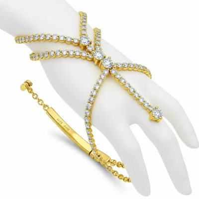 The Ring Bracelet Gold is a breathtaking fusion of elegant design, uniting a delicate finger ring with a shimmering wrist chain. Crafted in luminous 18KT yellow gold, this hand harness drapes beautifully, emphasizing graceful movement across the hand. It features meticulously set VVS diamonds that capture the light along its entire length, creating maximum sparkle. This piece represents modern luxury and is the ultimate statement accessory for sophisticated evenings, transforming conventional jewelry boundaries.