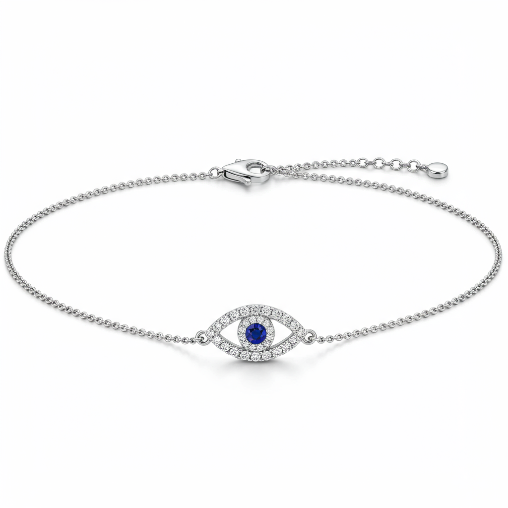 Ward off negativity in luxurious style with this exquisite Evil Eye Bracelet. Crafted in polished 18KT gold, the central talisman features brilliant VVS round diamonds micro-pave set around a deep blue sapphire and a striking black diamond pupil. The dainty chain offers adjustable wear, ensuring perfect comfort and movement on the wrist. This piece masterfully blends ancient protective symbolism with high-end contemporary design, making it an essential addition to any fine jewelry collection.