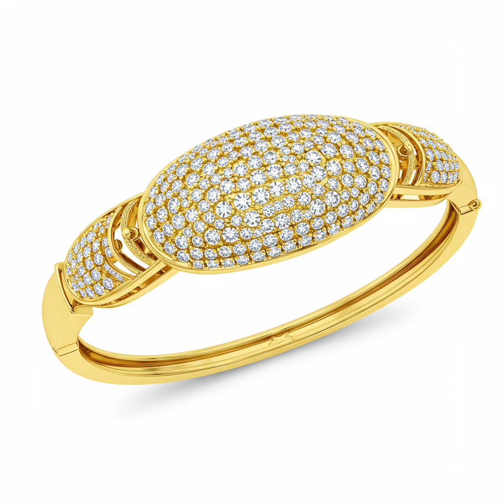 The Kada Bracelet is a masterpiece of contemporary design, blending robust 18KT gold structure with dazzling diamond artistry. This piece features a continuous line of brilliant round diamonds meticulously set in a secure pave formation, ensuring maximum sparkle from every angle. Its substantial yet comfortable form makes it an ideal statement piece for formal occasions or sophisticated daily wear. A true heirloom, this kada symbolizes enduring strength and luxurious elegance.