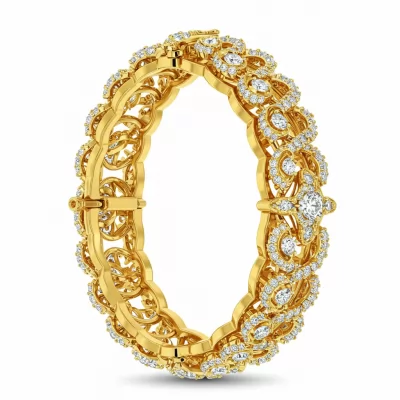 The Malabar Gold Bracelet is an exquisite testament to traditional craftsmanship reimagined for the modern era. Crafted in radiant 18KT yellow gold, this piece features intricate, sculpted links that flow gracefully around the wrist, catching the light with every movement. The polished finish emphasizes the richness of the metal, creating a bold yet elegant statement. This heirloom-quality bracelet is secured with a robust, custom clasp, ensuring both security and comfort for daily wear.