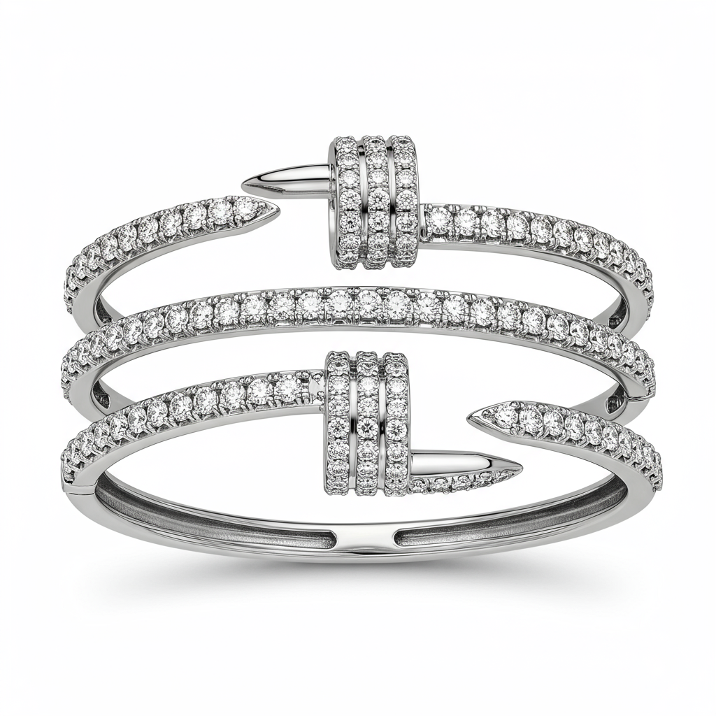The iconic Nail Bracelet redefines contemporary luxury, transforming a utilitarian object into a masterpiece of wearable art. Crafted in polished 18KT white gold, this cuff features a brilliant array of pave-set VVS diamonds along the head and shaft. Its signature design blends sharp, modern lines with effortless sophistication, offering a bold yet elegant statement piece. This hinged bangle ensures a secure and comfortable fit, making it perfect for both daily wear and glamorous evenings.