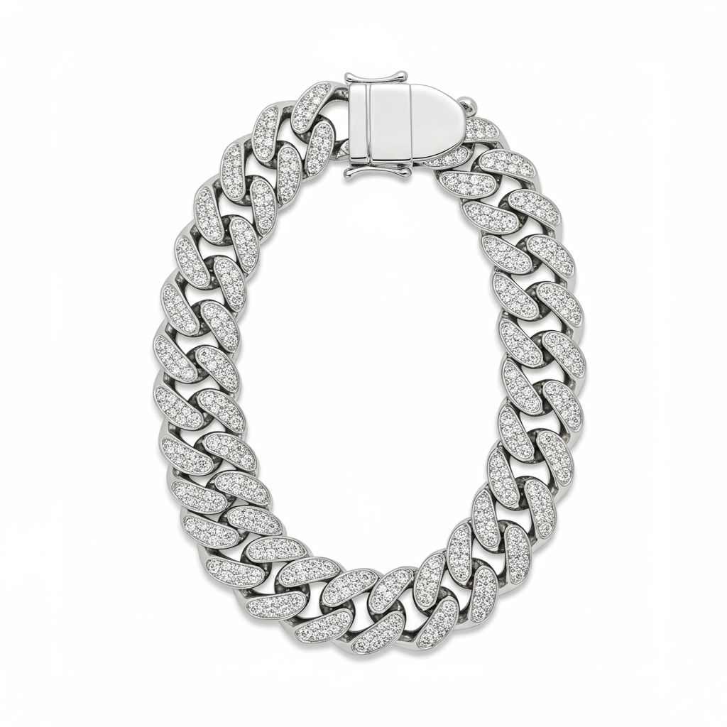 The Ultimate Diamond Cuban Link Bracelet is the pinnacle of modern masculine luxury, meticulously crafted in weighty 18KT white gold. Each substantial link is completely pavé-set with brilliant VVS diamonds, catching light from every angle. This piece seamlessly merges traditional design strength with contemporary diamond elegance and is built for durability and show-stopping appeal. Secured by a hidden box clasp, this bracelet ensures both comfort and an unwavering sense of powerful style, defining the wrist of the discerning gentleman.