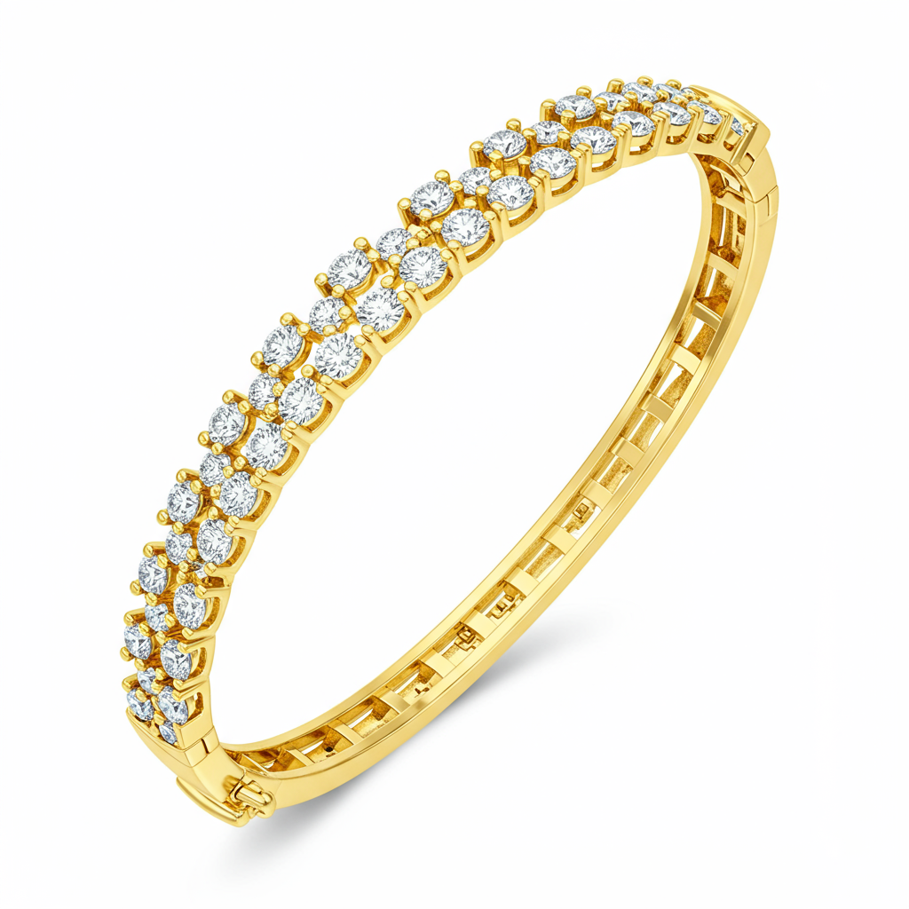 This exquisite 18KT yellow gold bangle redefines luxury with its timeless silhouette and substantial feel. It is meticulously adorned with brilliant round diamonds set securely along the upper curve, maximizing fire and brilliance. The ergonomic hinge ensures a comfortable and secure fit for daily wear or special occasions. This sophisticated piece symbolizes enduring craftsmanship and is designed to be a treasured heirloom. It is the perfect statement accessory for the modern woman.